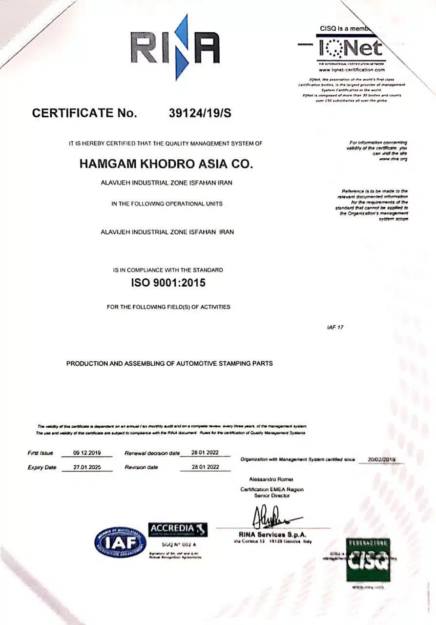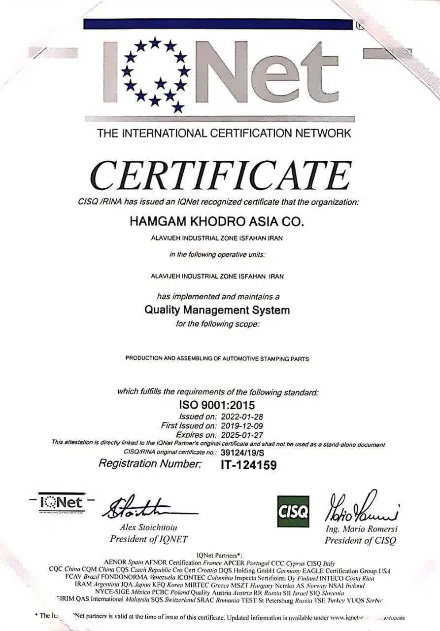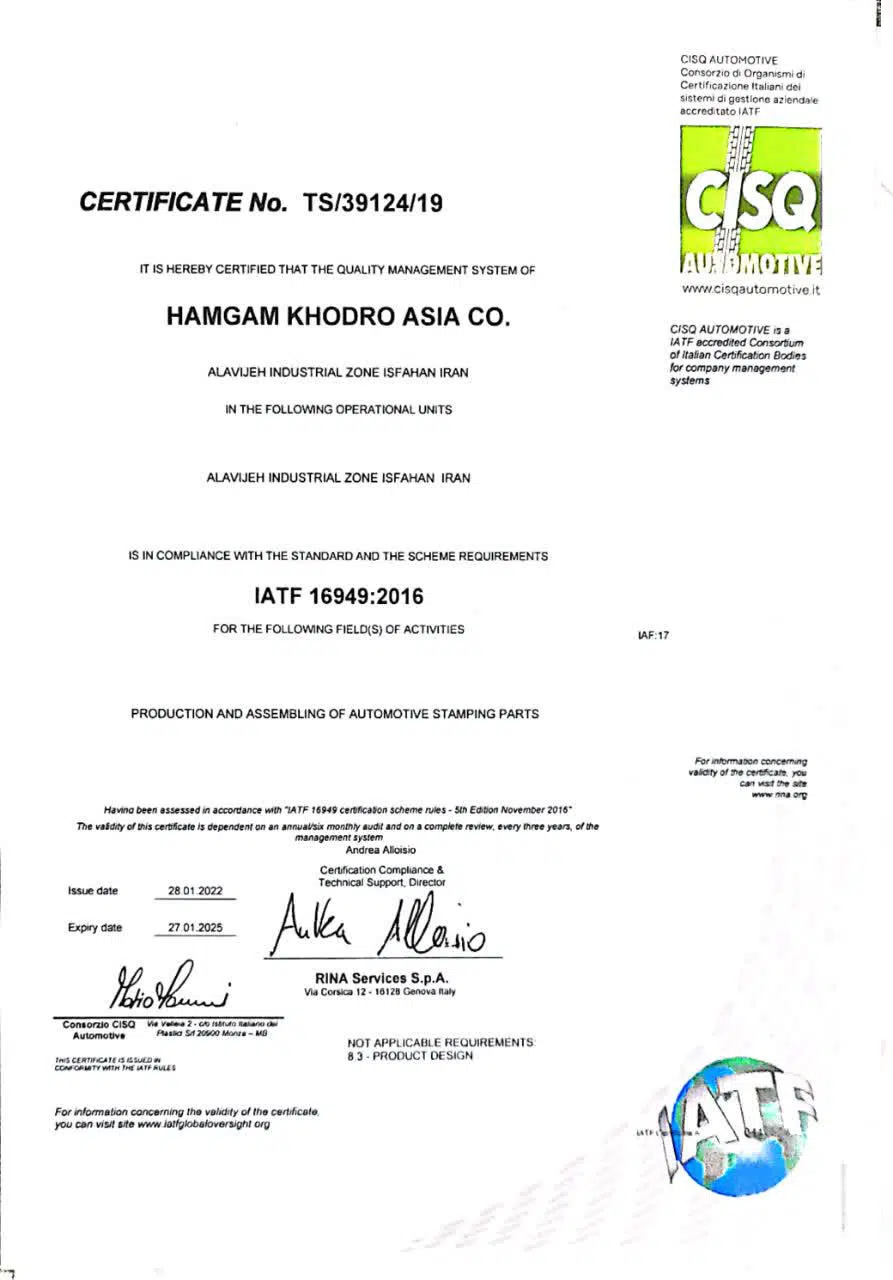 شرکت همگام خودرو آسیا (سهامی خاص) در مسیر توسعه پایدار مجموعه همگام و بهبود مستمر عملکرد سازمان، با اتکا بر تعهد، تجربه و مهارت همکاران خود با بکارگیری ماشین آلات کارآمد و اختصاصی متناسب با فرآیند، در راستای انطباق با قوانین و مقررات ناظر بر کیفیت محصول، استاندارد بین المللی 16949:2016 IATF و الزامات مشتریان و سایر ذینفعان را سرلوحه سیستم مدیریت کیفیت خود قرار داده و همچون گذشته با شعار یک گام جلوتر و در مسیر بهبود مستمر، متعهد به تحقق آرمان های متعالی زیر می باشد :